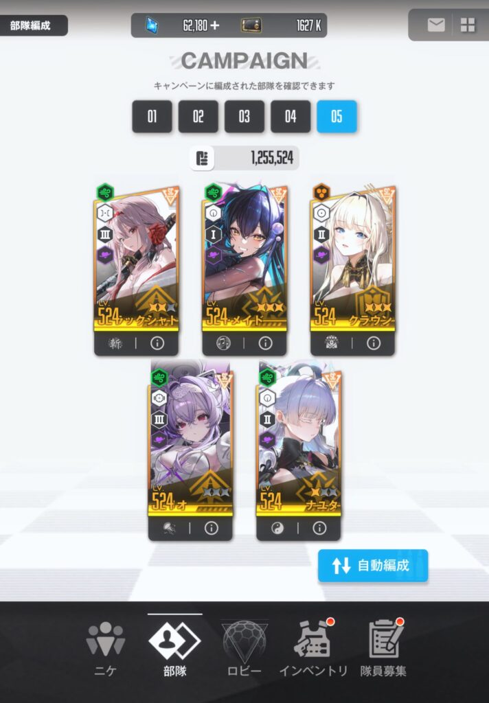 以前紹介した9段階編成からは、アスカ:WILLEとヘルムがOUTし、新たにリバーレリオとナユタがINしました。