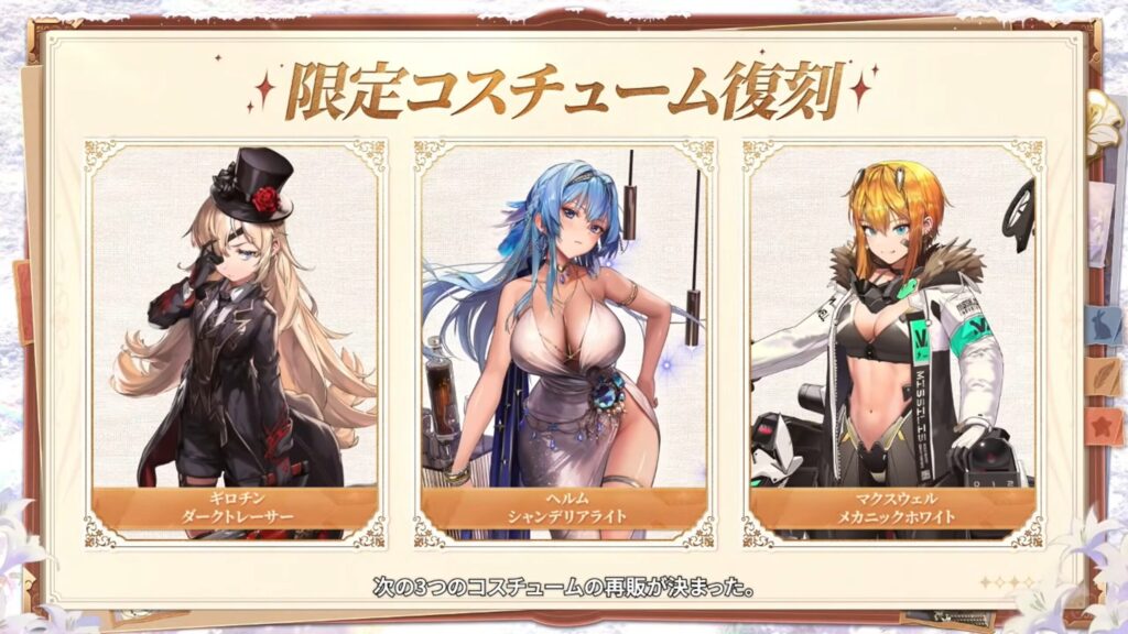 個人的には、ヘルムのドレス衣装の復刻を待ち焦がれていたので、必ず購入する予定です。