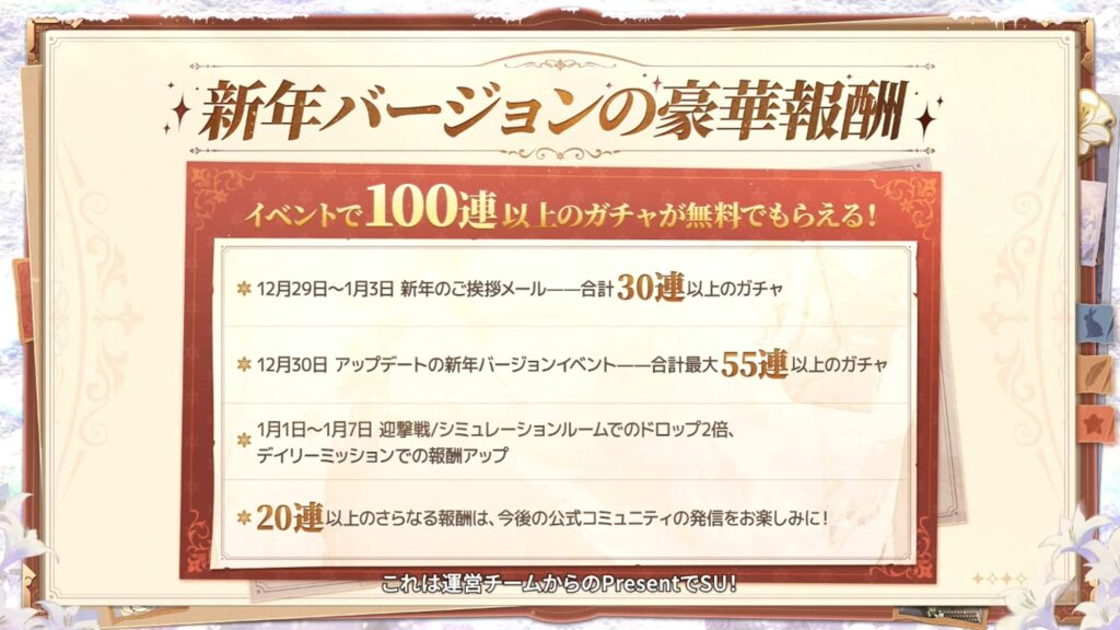 今回のイベントでは、合計100連以上のガチャが配布されるそうです。