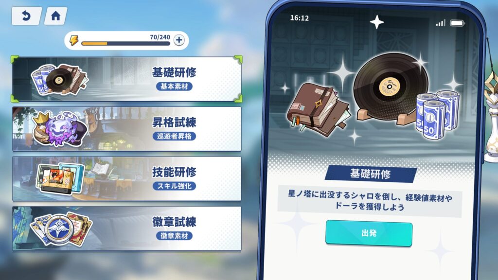 スタミナ(やる気)を消費して挑戦し、育成素材を集める定番コンテンツ。