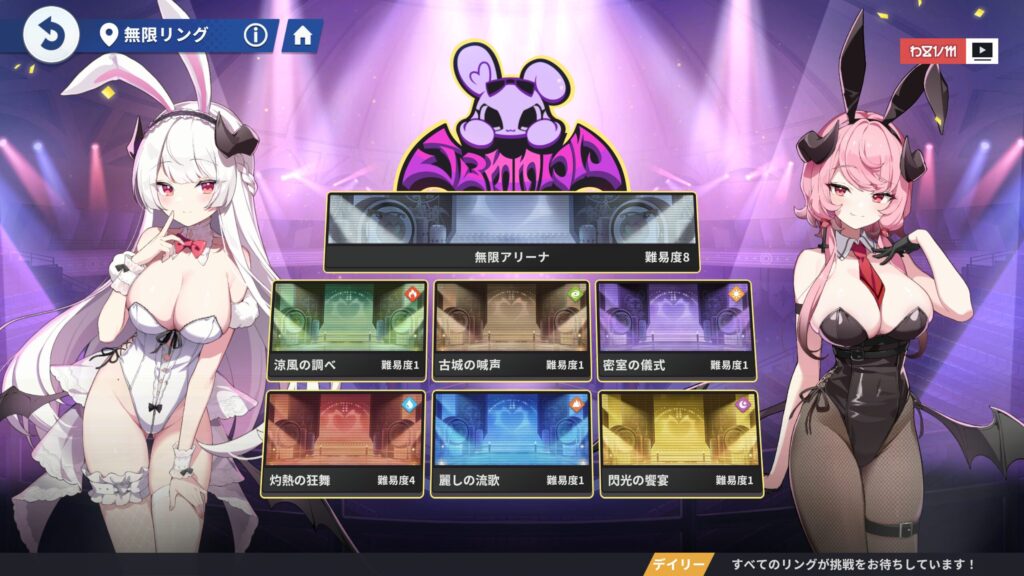 誰でも挑戦できる「無限アリーナ」と、指定された属性のキャラのみが挑戦できる各属性のリングがあります。